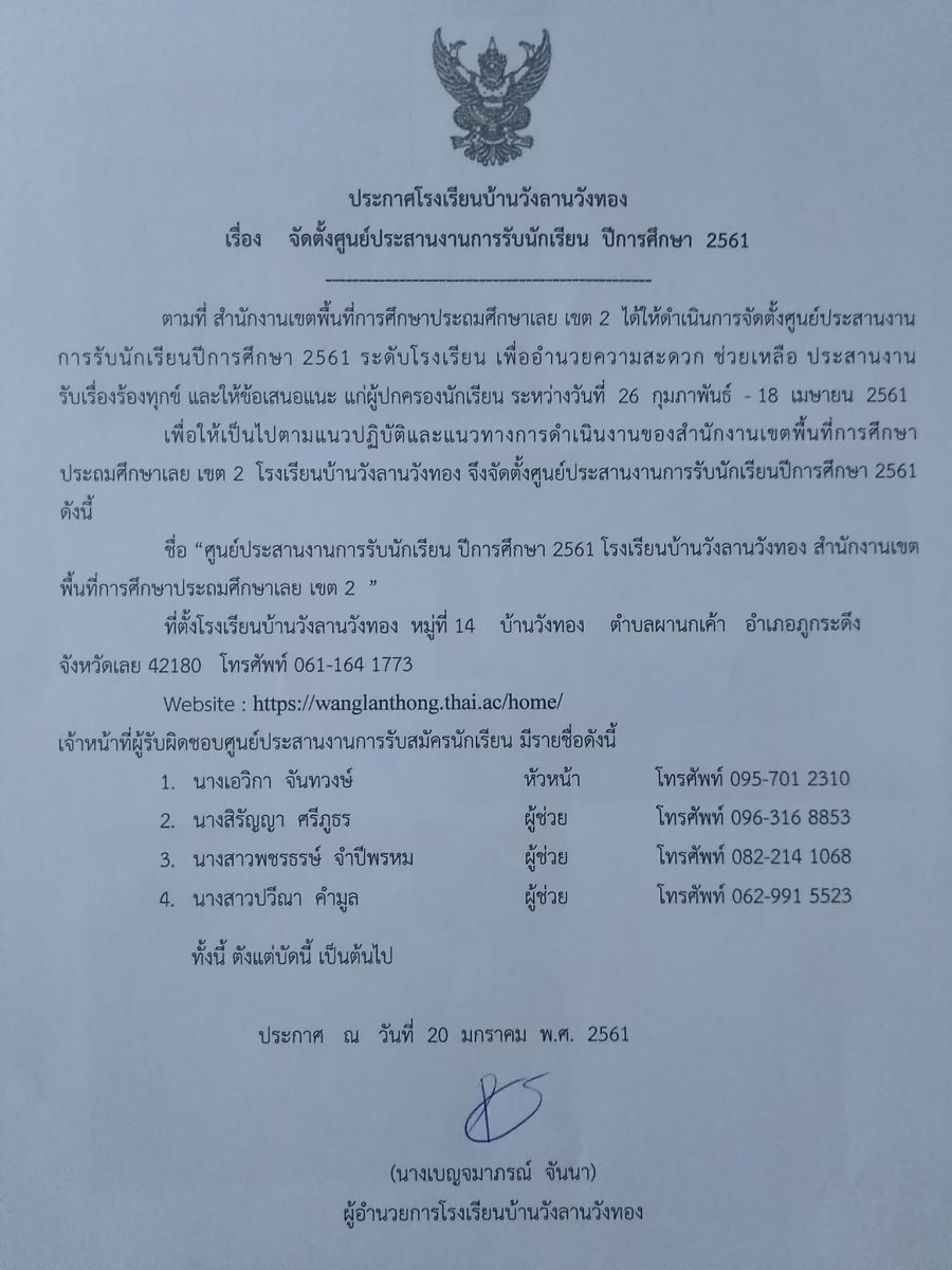 ประกาศ ศูนย์ประสานงานการรับนักเรียน โรงเรียนบ้านวังลานวังทอง ปี 2561